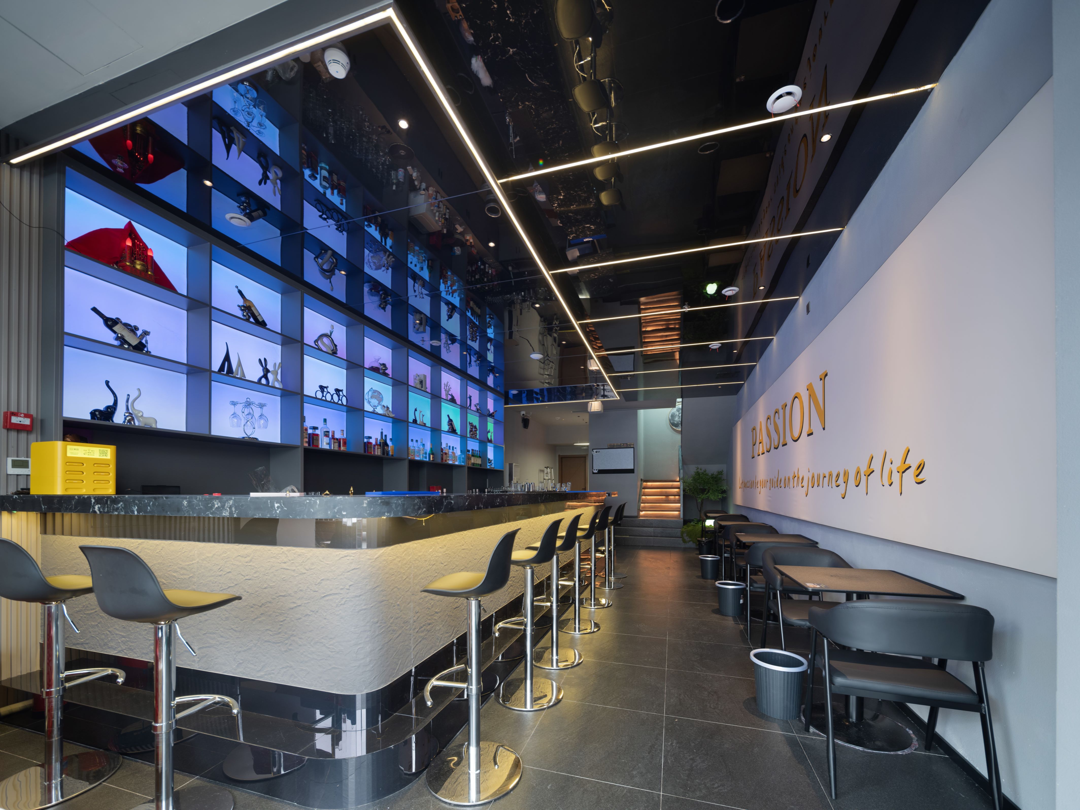 酒吧的裝修,關(guān)鍵在于營(yíng)造氛圍本案的入口處設(shè)計(jì)酷炫的燈光墻,吸引客戶的目光,地面選用深色瓷磚,增強(qiáng)質(zhì)感。吧臺(tái)是酒吧的核心,使用大理石臺(tái)面,搭配金屬高腳凳,酒架選擇玻璃和金屬材質(zhì),炫麗的燈光打在酒瓶上,炫彩奪目。家具選用深色系,更顯格調(diào)